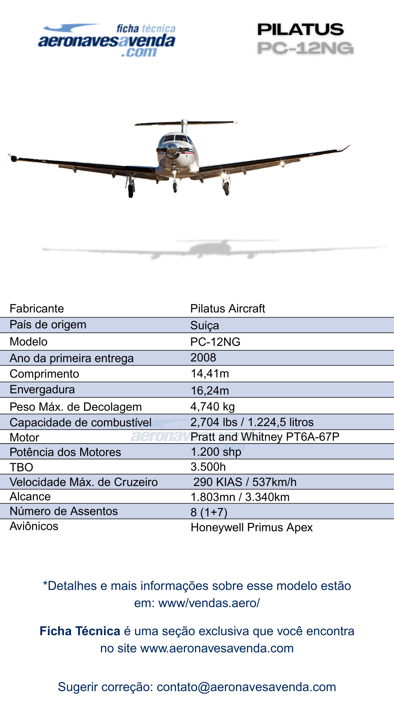 Fabricado pela Pilatus Aircraft, o PC-12 NG combina excelente desempenho com um design robusto, sendo ideal tanto para missões executivas quanto para transporte de carga, voos aeromédicos e operações em pistas curtas ou não preparadas.