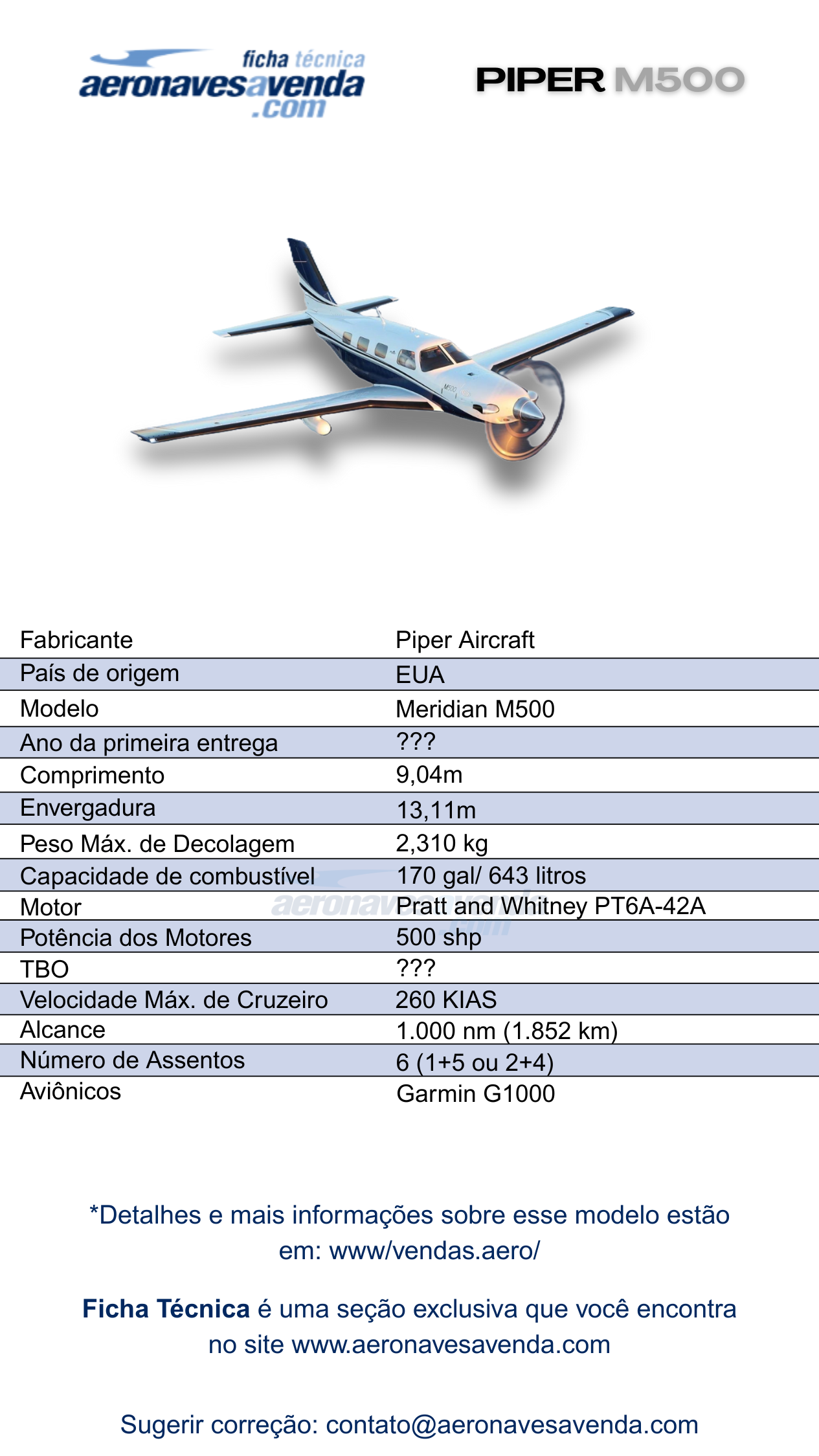 O Piper M500 é uma aeronave monomotora turboélice de alta performance, desenvolvida pela Piper Aircraft. Ele é parte da série M da fabricante, que inclui aeronaves de alta qualidade e com sistemas avançados, projetadas tanto para uso pessoal quanto para voos comerciais de pequeno porte. O M500 é uma evolução do Piper Malibu Mirage, oferecendo um desempenho aprimorado e uma experiência de voo confortável e eficiente.